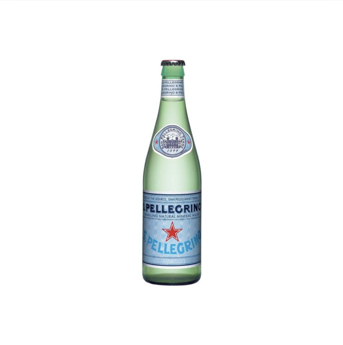 S. Pellegrino in a glass bottle is a premium brand of sparkling mineral water, known for its refreshing, crisp taste and delicate effervescence.