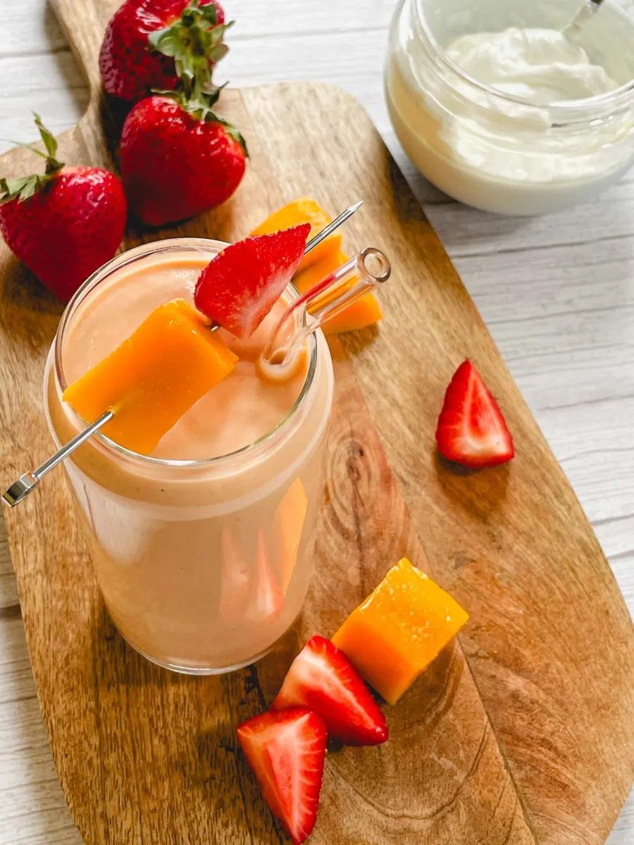 Strawberry, Banana, Pineapple, Mango, Coconut, Non-Fat Vanilla Yogurt, Orange Juice.